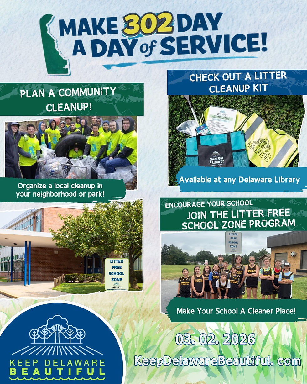 On March 2, 2026 (302 Day), residents across Delaware are encouraged to make it a day of service by giving back to their communities. Through Keep Delaware Beautiful, individuals and groups can plan a neighborhood or park cleanup, check out a free litter cleanup kit from any Delaware library, or encourage their school to join the Litter Free School Zone program to help create a cleaner campus.